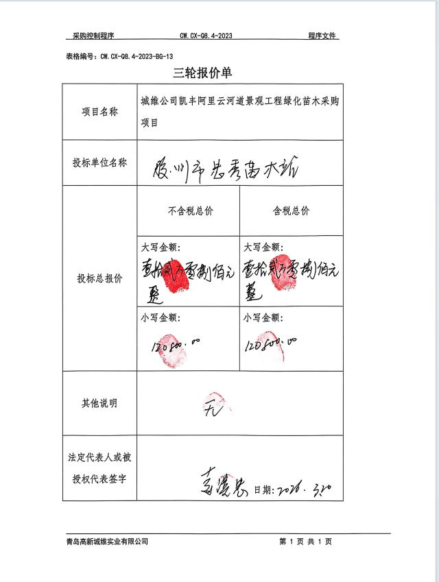 城维公司凯丰阿里云河道景观工程绿化苗木采购项目于2026年3月20日上午9时30分,青岛高新区聚贤桥路50号1号楼9层会议室开标。