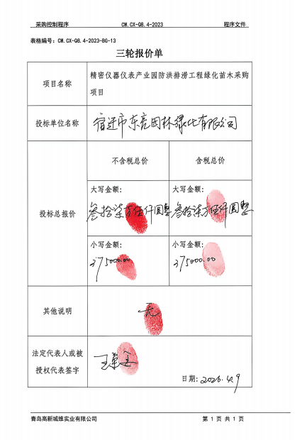 精密仪器仪表产业园防洪排涝工程绿化苗木采购项目于2026年4月9日上午9时00分,青岛高新区聚贤桥路50号1号楼8层会议室开标。