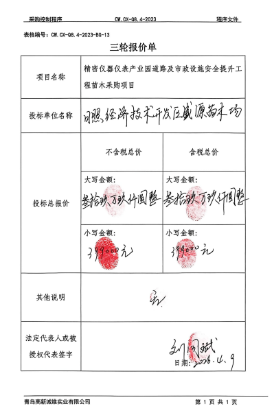 精密仪器仪表产业园道路及市政设施安全提升工程苗木采购项目于2026年4月9日下午14时30分,青岛高新区聚贤桥路50号1号楼8层会议室开标。
