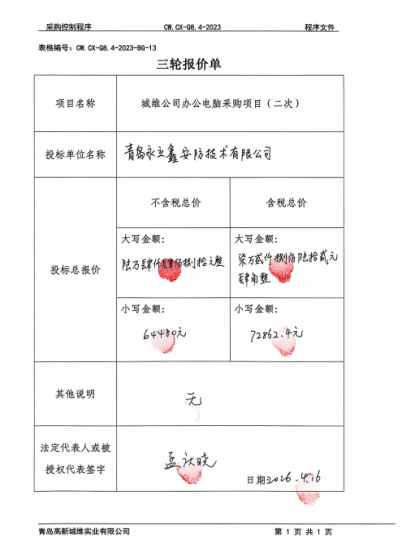 城维公司办公电脑采购项目(二次)于2026年4月16日14时00分,青岛高新区聚贤桥路50号1号楼9层会议室开标。